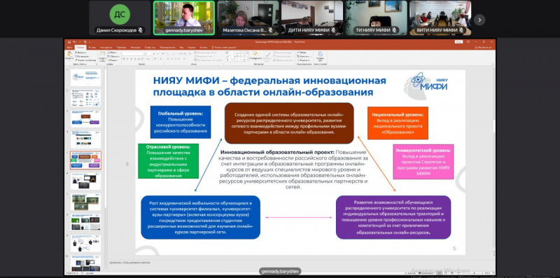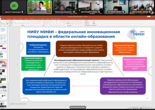 Начальник отдела онлайн-образования учебного департамента Г.К. Барышев рассказал о достижениях МИФИ в сфере онлайн-образования, достигнутых результатах за несколько лет разработки и размещения онлайн-курсов на национальной платформе «Открытое образование». Одним из достижений является признание за МИФИ статуса федеральной инновационной площадки Минобрнауки РФ в сфере онлайн-образования, и в этом есть в том числе вклад филиалов университета, которые создают уникальную коллекцию профильных онлайн-курсов, в которых МИФИ является признанным экспертом в российском и мировом образовании.