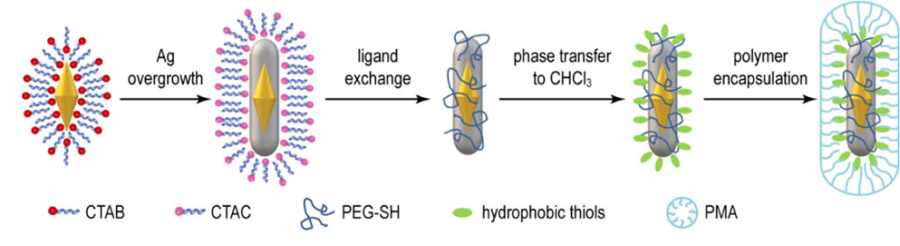 Схематическое изображение процедуры получения серебряных наностержней, покрытых PMA (Ag@PMA NRs)
