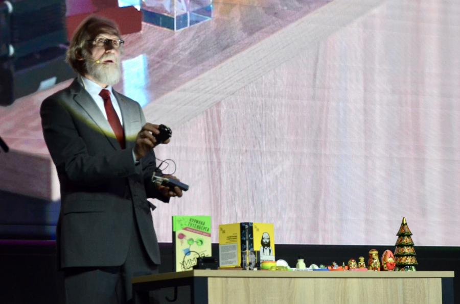 На сцене он провёл научный опыт, а затем на основе эксперимента задал участникам о м дин из конкурсных вопросов, проверив их знания и научное мышление.