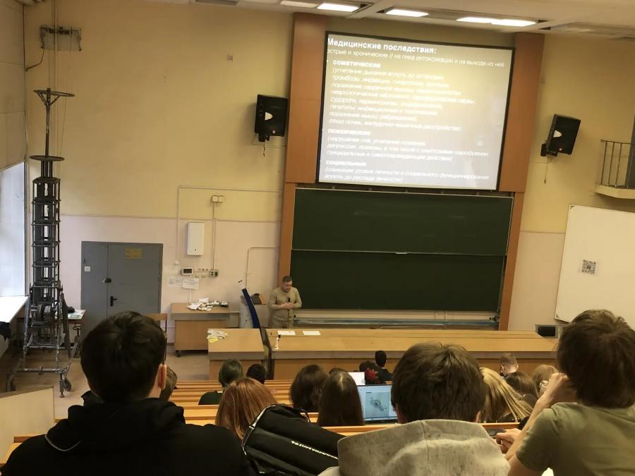 В ходе встречи была прочитана лекция, посвященная профилактике вовлечения студенческой молодежи в противоправную деятельность, связанную с незаконным оборотом наркотических средств, предупреждению распространения наркомании среди молодёжи, а также повышение уровня осведомлённости обучающихся о последствиях потребления запрещенных веществ и об ответственности за участие в их незаконном обороте.